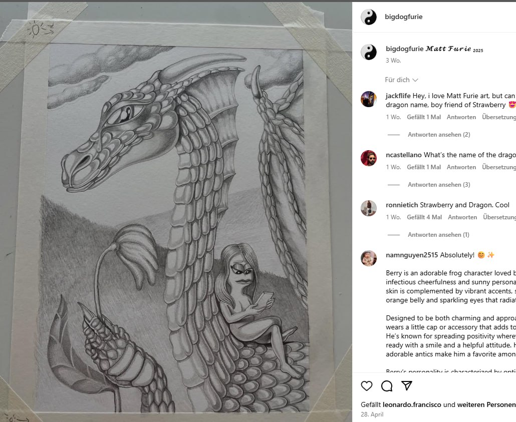 Toki isn’t just part of the gang — he’s the glue, the groove, the guardian of good vibes in Furie’s surreal friendiverse. He’s been front and center on Matt’s homepage, and floating through the Instagram feed like a chill cloud of cosmic joy — most recently spotted just a month ago on April 28th, spreading the sparkle with Pepe, Hoppy, Strawberry, and the other freaky friends.